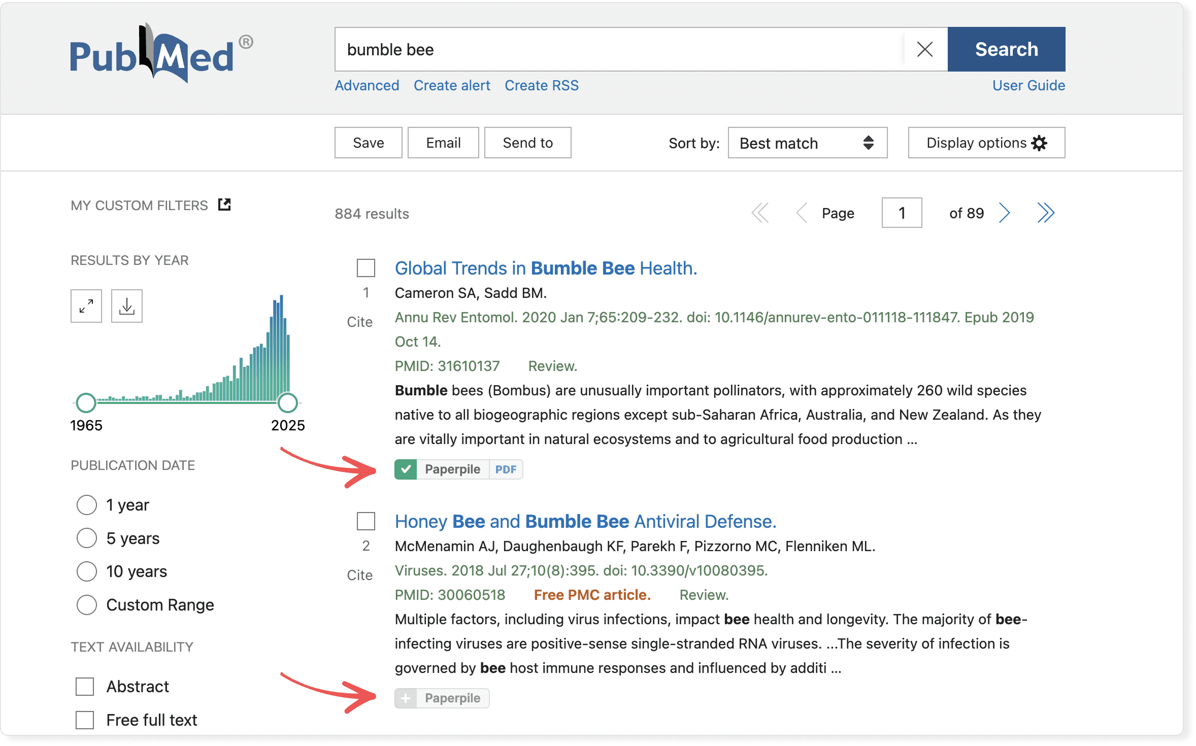 On supported sites like Google Scholar and PubMed, Paperpile adds save buttons directly to search results: