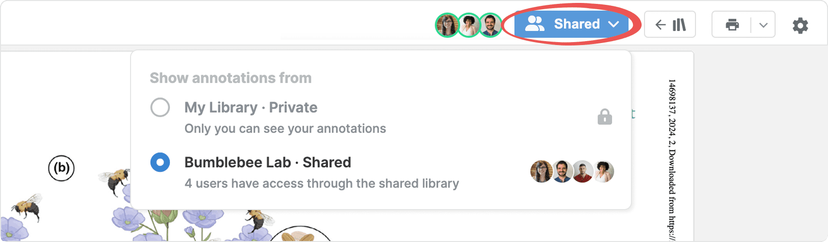 When you open a PDF, choose between private (in your personal library) or collaborative annotations (in shared libraries and in shared folders).