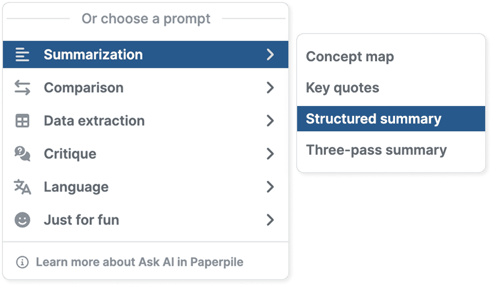 Paperpile offers high-quality prompts organized by category to help you analyze research papers effectively. Select a prompt that matches your needs, such as summarizing key findings, analyzing methodology, or comparing studies.