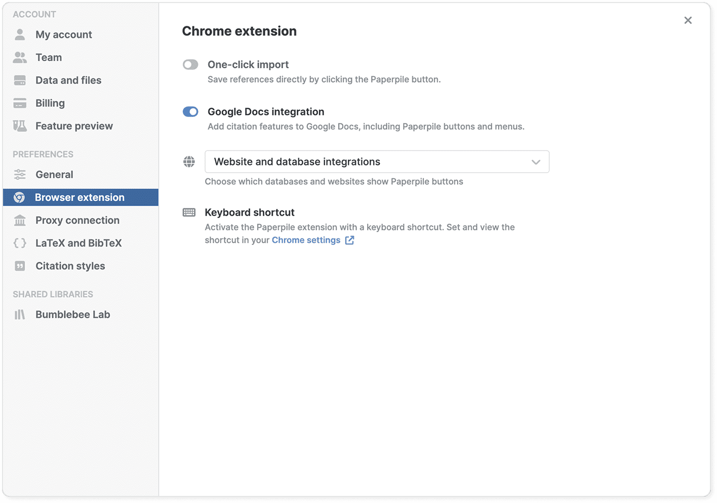You can customize how the Paperpile browser extension works by adjusting settings both in the web app and directly in the extension popup. These settings help you tailor the extension to your research workflow and control which websites and databases integrate with Paperpile.