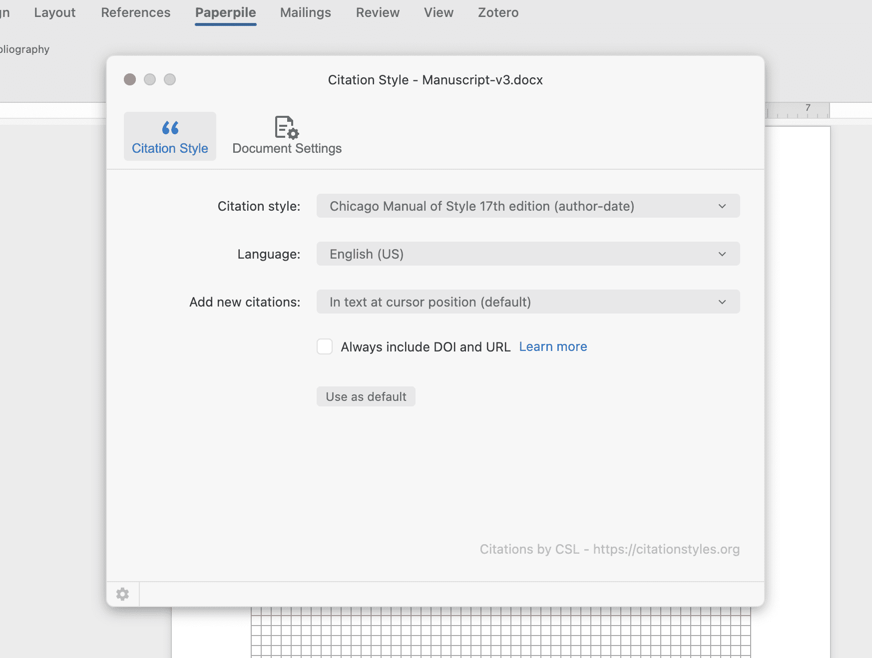 Turning on the option Always include DOI and URLs can override the citation style behavior in both Google Docs and Word, showing DOIs as specified by the citation style.