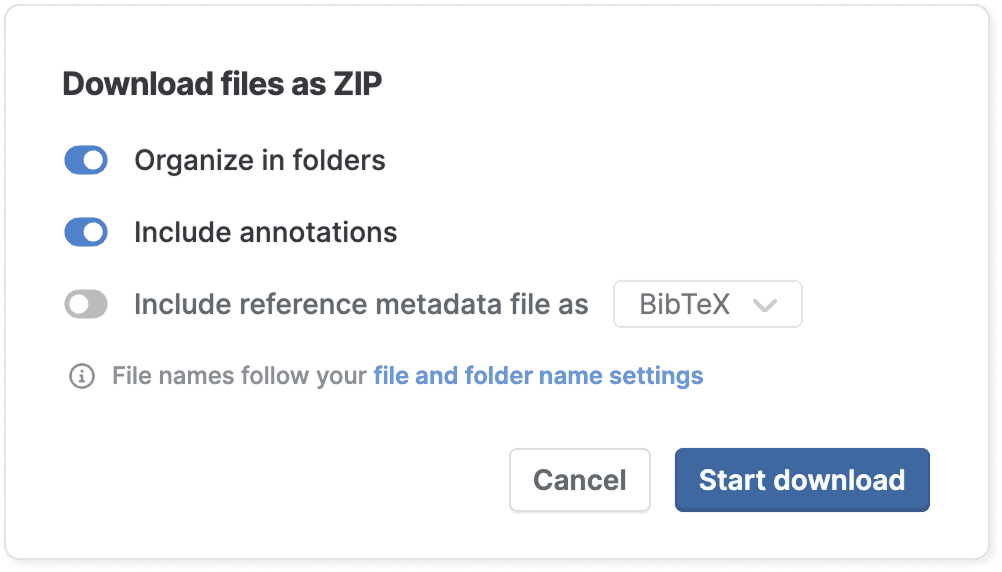 Paperpile creates a zip file and downloads it to your computer. The files inside are organized and named according to your file and folder organization settings.