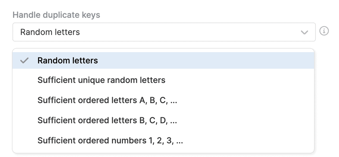 - Sufficient unique random letters — Adds random letters only to duplicate keys. Use [unique:1] for one letter, [unique:2] for two letters, and so on.