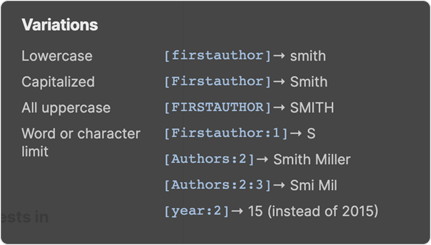 - Example: [Firstauthor:1] → uses just the first letter of the first author’s last name.
