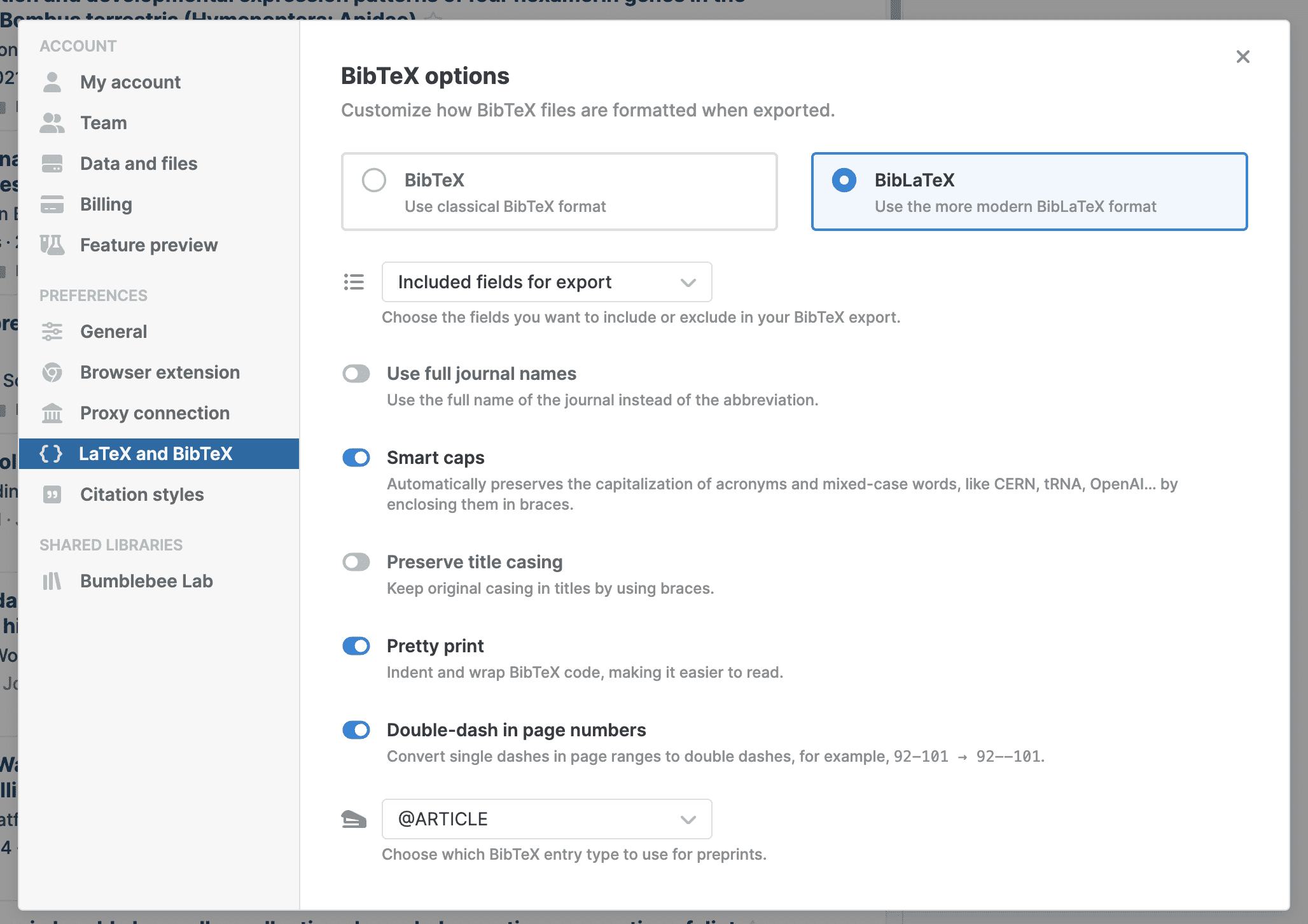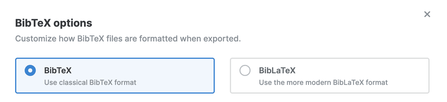 Choose between classical BibTeX format and the more modern BibLaTeX format, the fields you want to include in your BibTeX export, and more.
