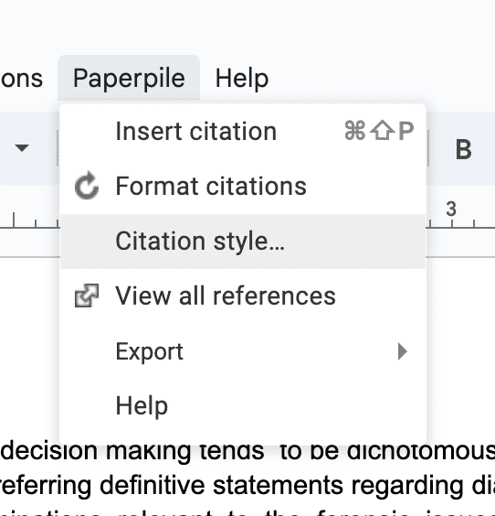 To choose a different style in your Google Docs document, open the citation style dialog via the top menu option Paperpile > Citation style: