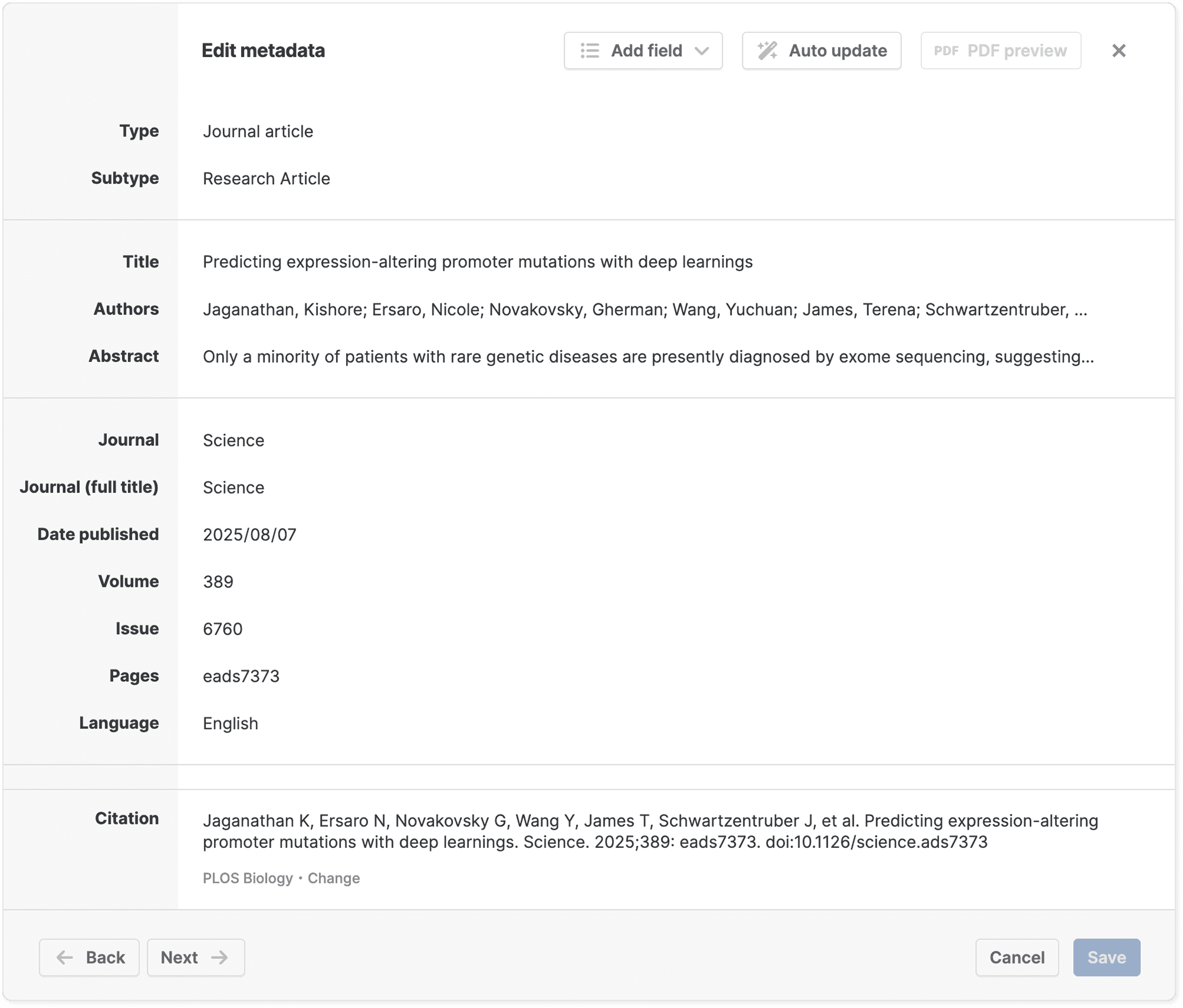Edit and refine the metadata for your references to ensure accurate citations and better organization. You can modify fields like title, authors, publication date, and more directly in Paperpile.