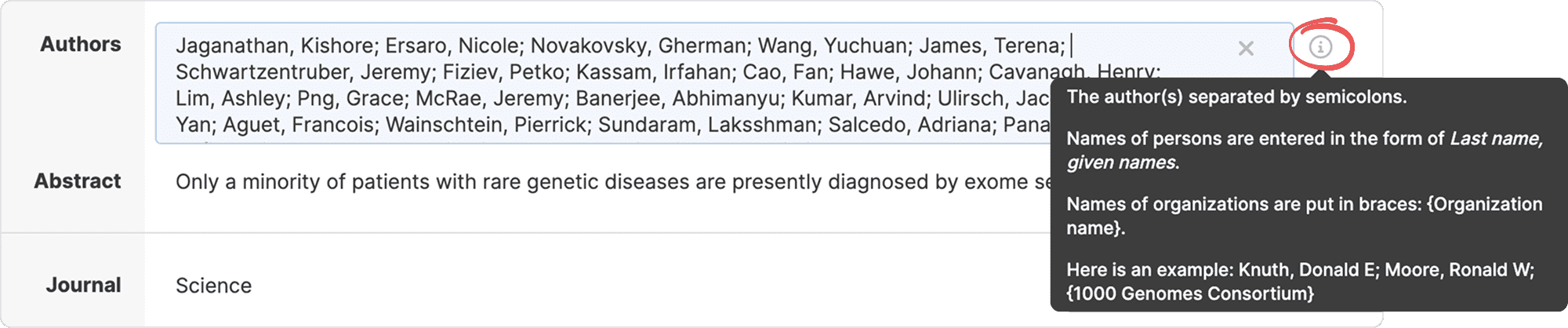 Enter author names in the Authors field separated by semicolons. Click the info button next to the Authors field to see examples of name formatting.