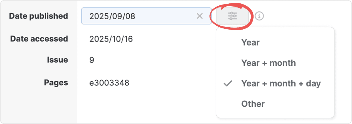 The Date published field controls how the publication date appears in your citations. Click the field, then click its menu button to select the date format: