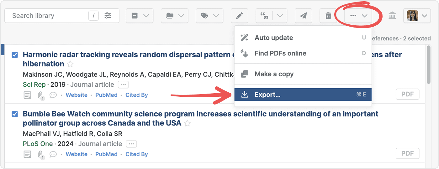 - Hold down the Shift key and click to select multiple references or click the checkbox next to each title to select one or more references from the list.