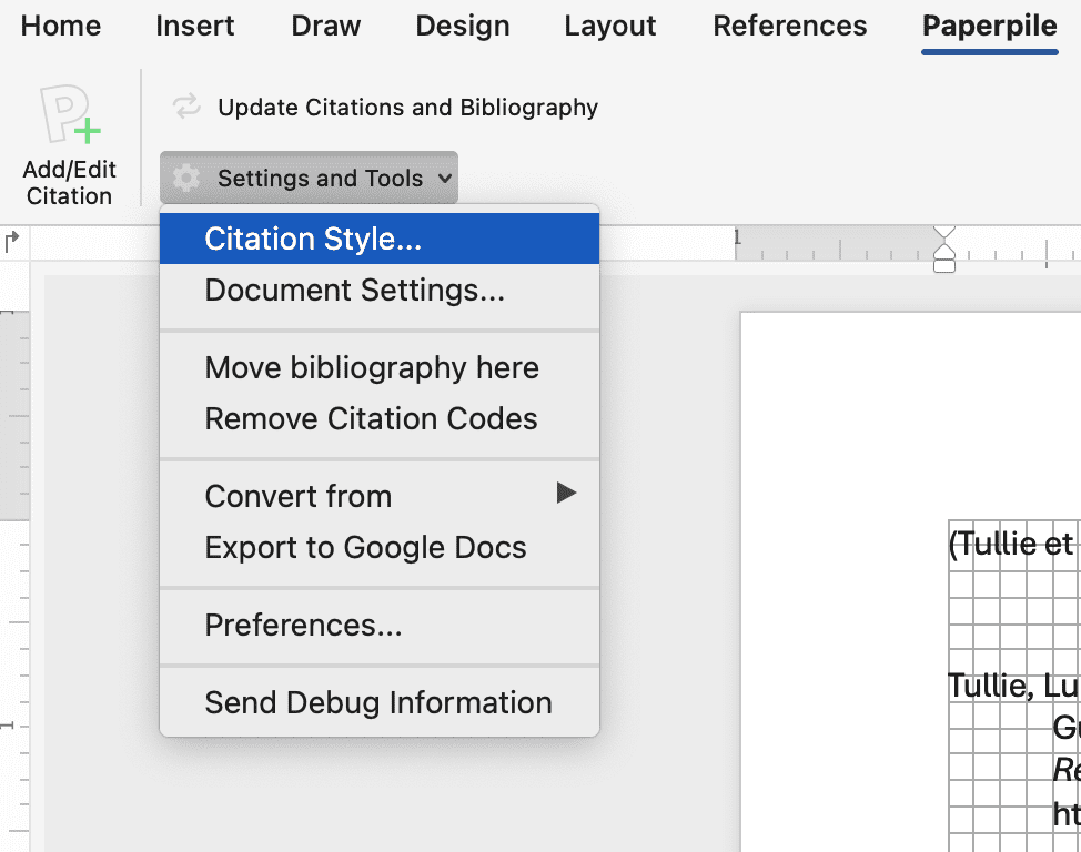 To choose a different style in your Word document, open the citation style dialog from the Paperpile tab by clicking Settings and Tools > Citation style: