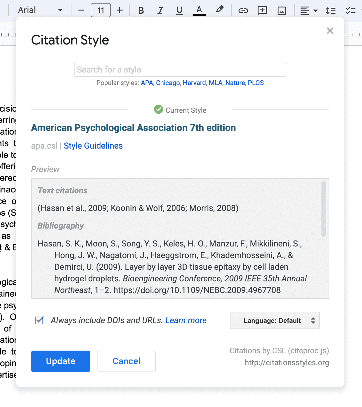 Turning on the option Always include DOI and URLs can override the citation style behavior in both Google Docs and Word, showing DOIs as specified by the citation style.