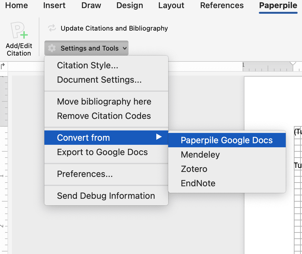 - Go to the Paperpile tab in the top ribbon and select Settings and Tools > Convert from > Paperpile Google Docs. This will convert the URLs to Word form fields, which remain editable but do not show up when you export to a PDF.