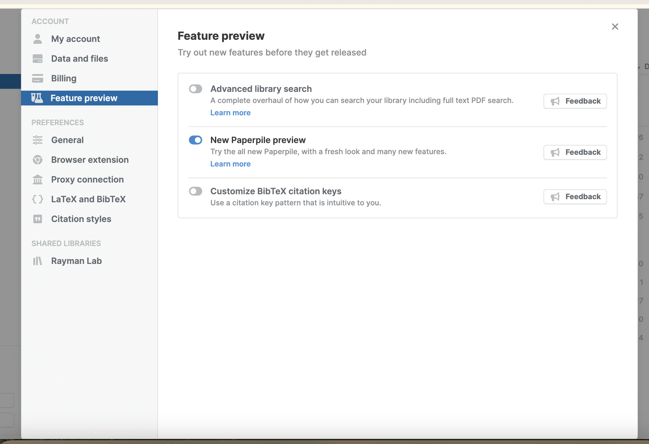 We continuously add new features to Paperpile. To activate them before public release, click your profile picture on the top right and go to Settings > Feature Preview and select the features you’d like to test.