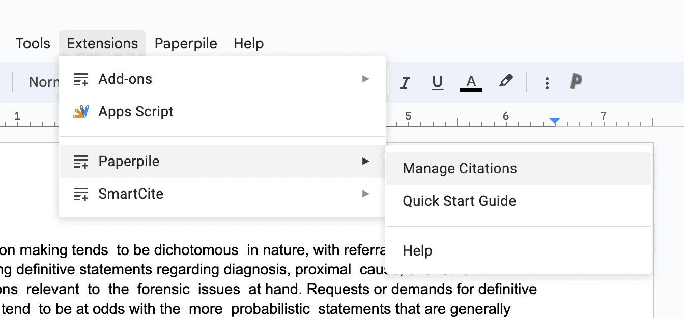 - Start the sidebar add-on from the document’s top ribbon: Extensions > Paperpile > Manage Citations