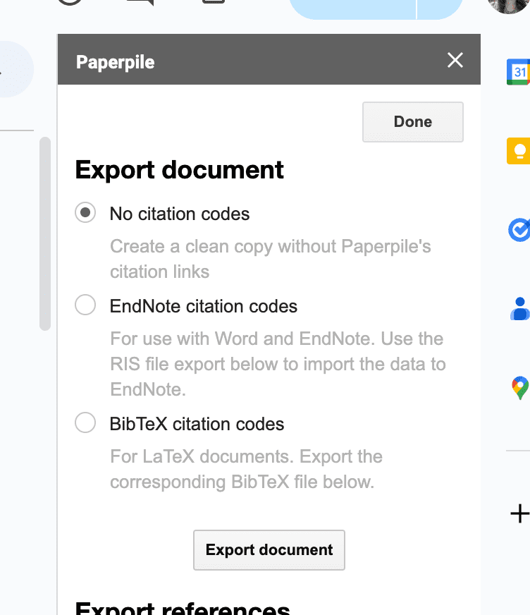 - Select No Citation codes and click Export document. This will create a copy of your Google Doc that does not contain any citation links.