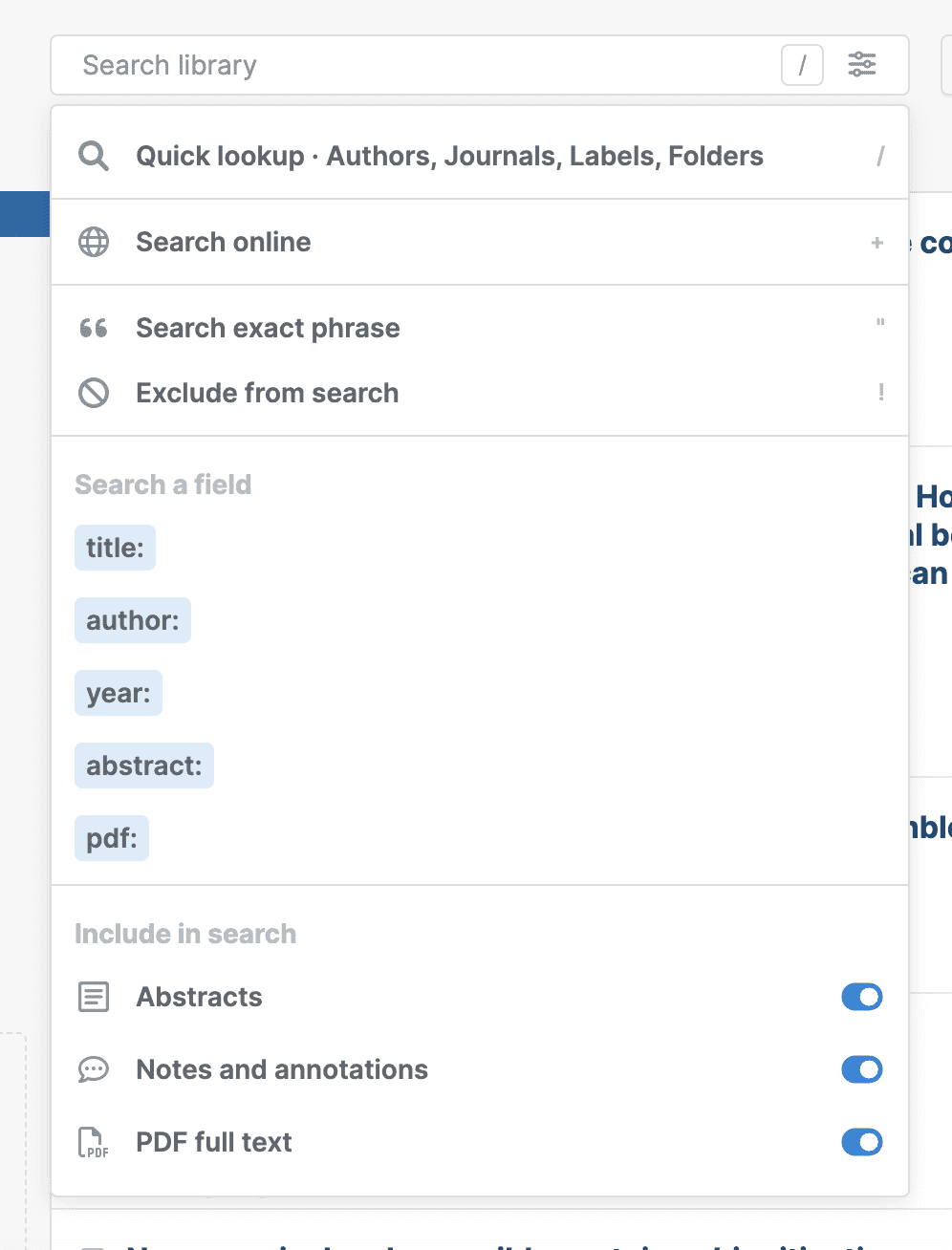 To search specific fields like title, author, year, abstract, and pdf, type the field name followed by a colon, or click the button on the right of the search box to open advanced search options.