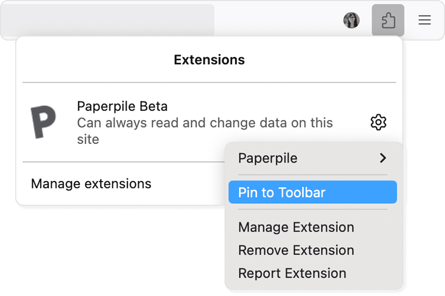 To pin the extension, click the puzzle piece in your Firefox toolbar, then click the pin next to Paperpile.