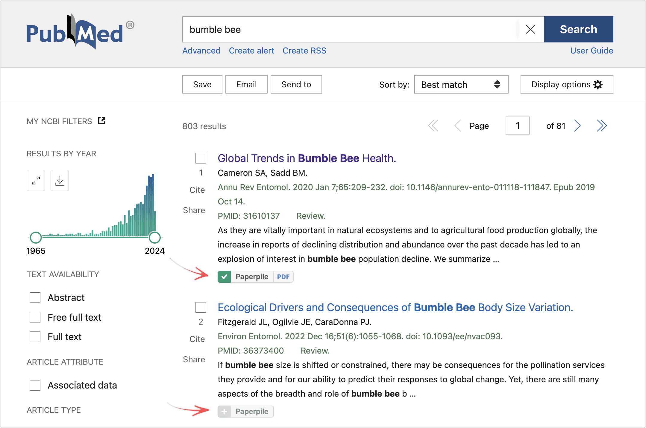 On many popular databases like Google Scholar, PubMed, or arXiv, you will see Paperpile buttons in the search results. Click these buttons to add the references and any associated PDFs to your library.