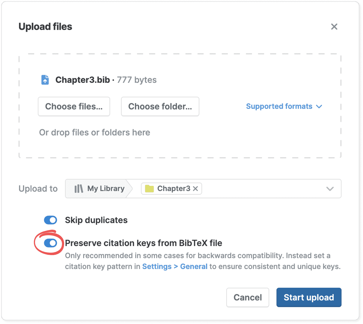 To preserve the original citation keys from the BibTeX file (for example, to retain compatibility with LaTeX documents), turn on Preserve citation keys from BibTeX file in the file upload dialog.