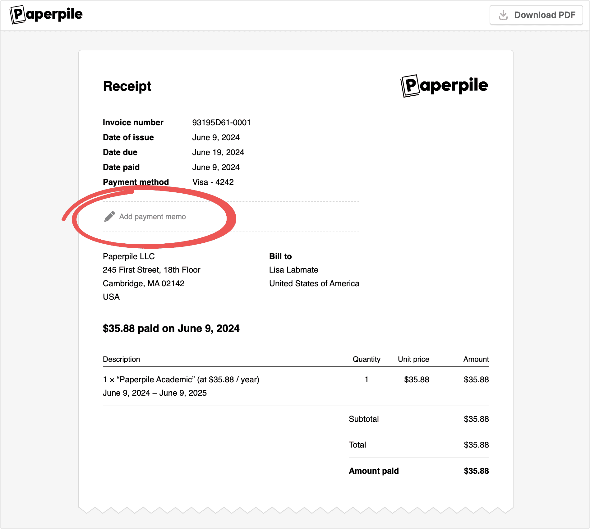 - To download the receipt with the memo, click Download PDF on the top right of the page.