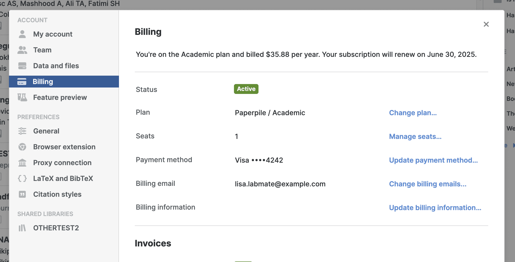 - Click View invoices to go to the invoice page. If it’s paid you will see the receipt. If your subscription is paid by invoice and an invoice is still open, you can pay it directly with Pay invoice.