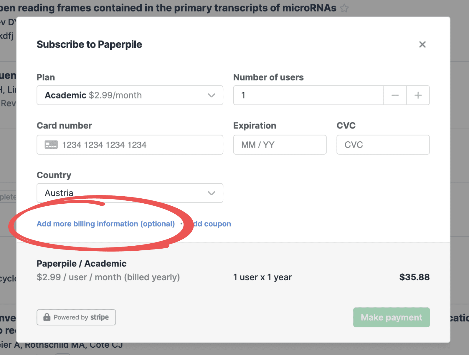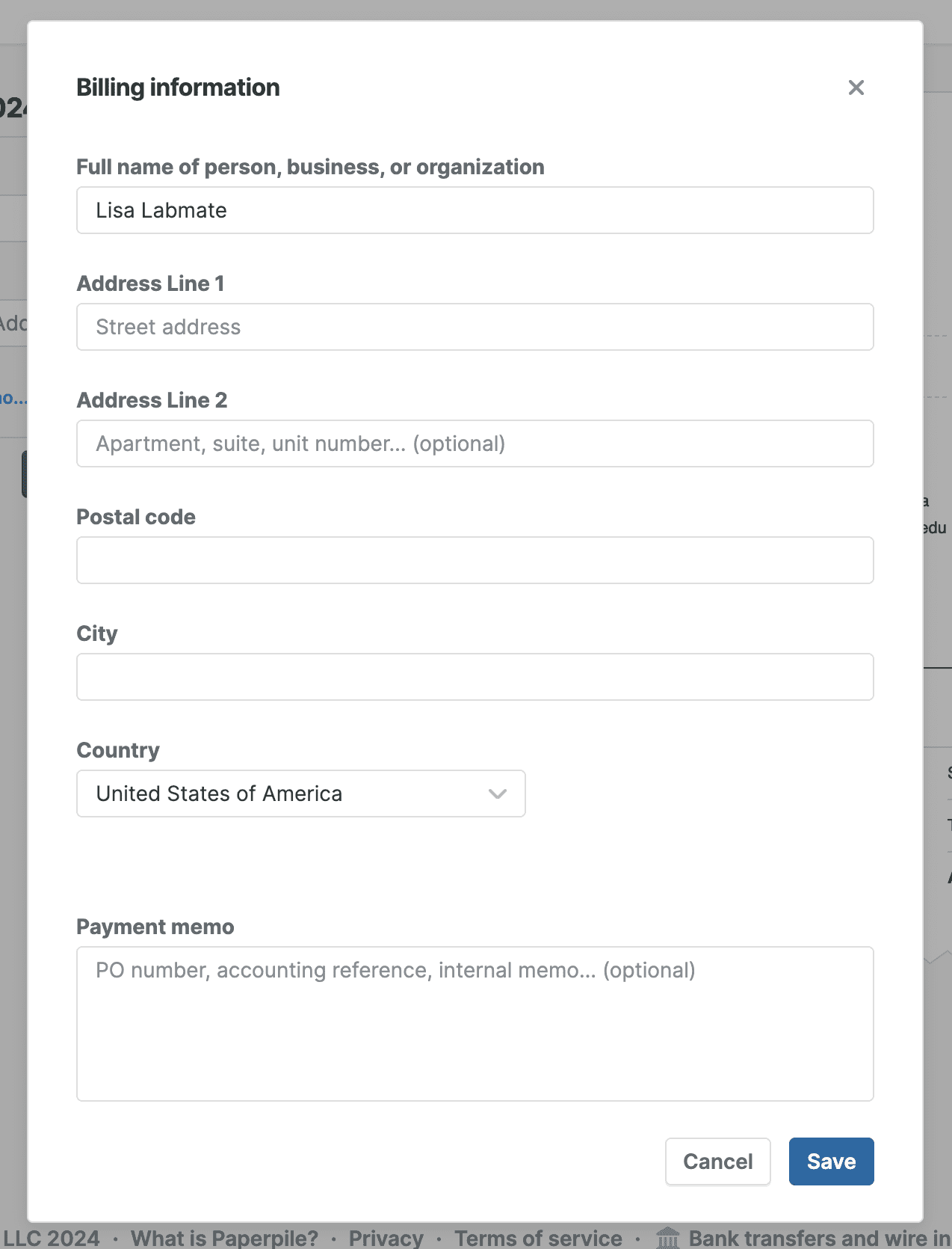 You cannot change the billing information after an invoice is paid. However, it’s possible to add some additional information for administrative purposes to a receipt as a “Payment memo”.