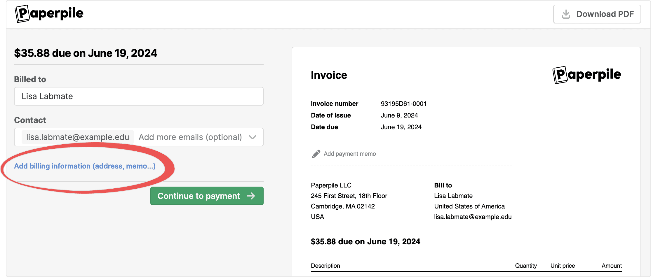 - To download an invoice or receipt, click Download PDF on the top right of the page