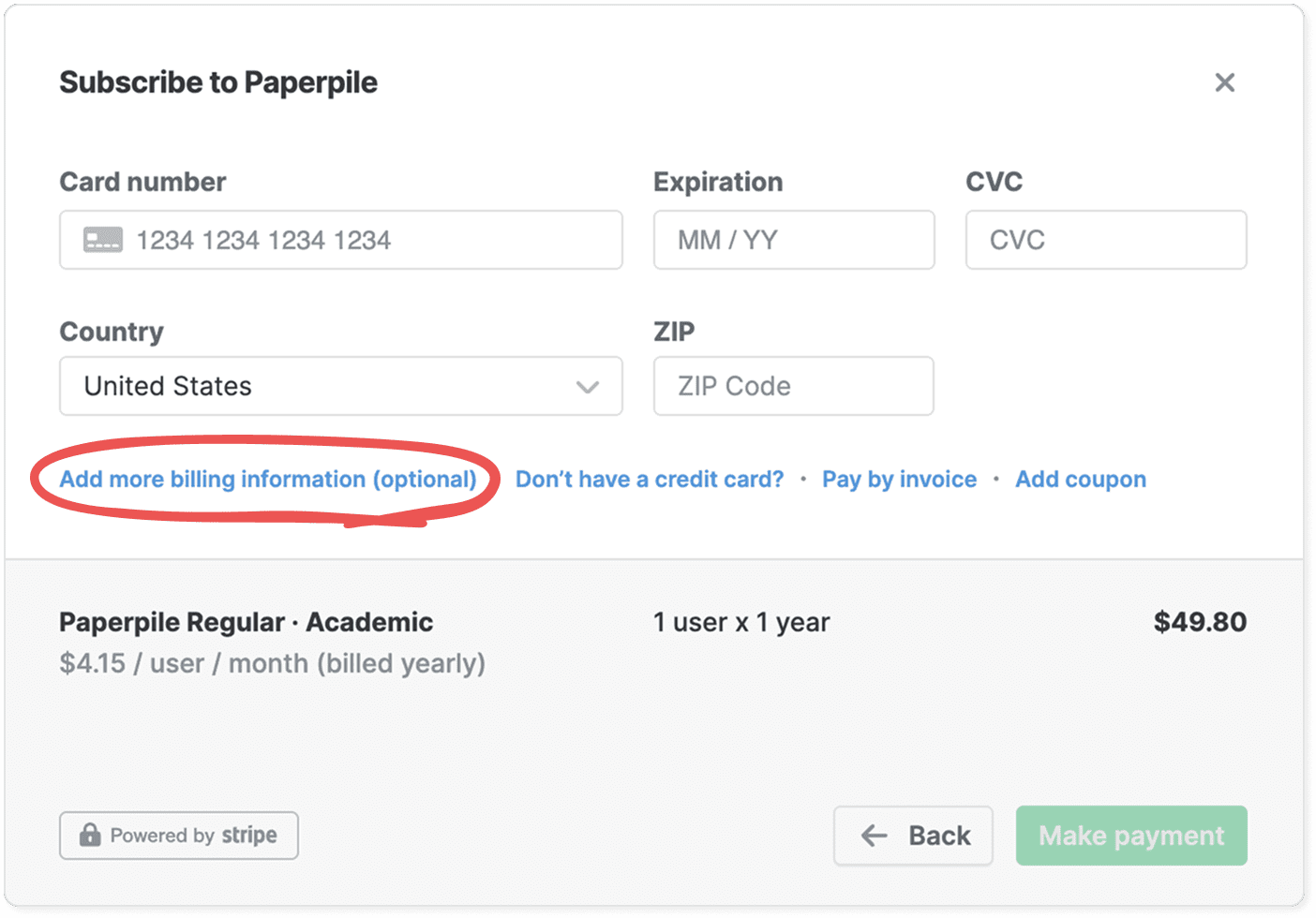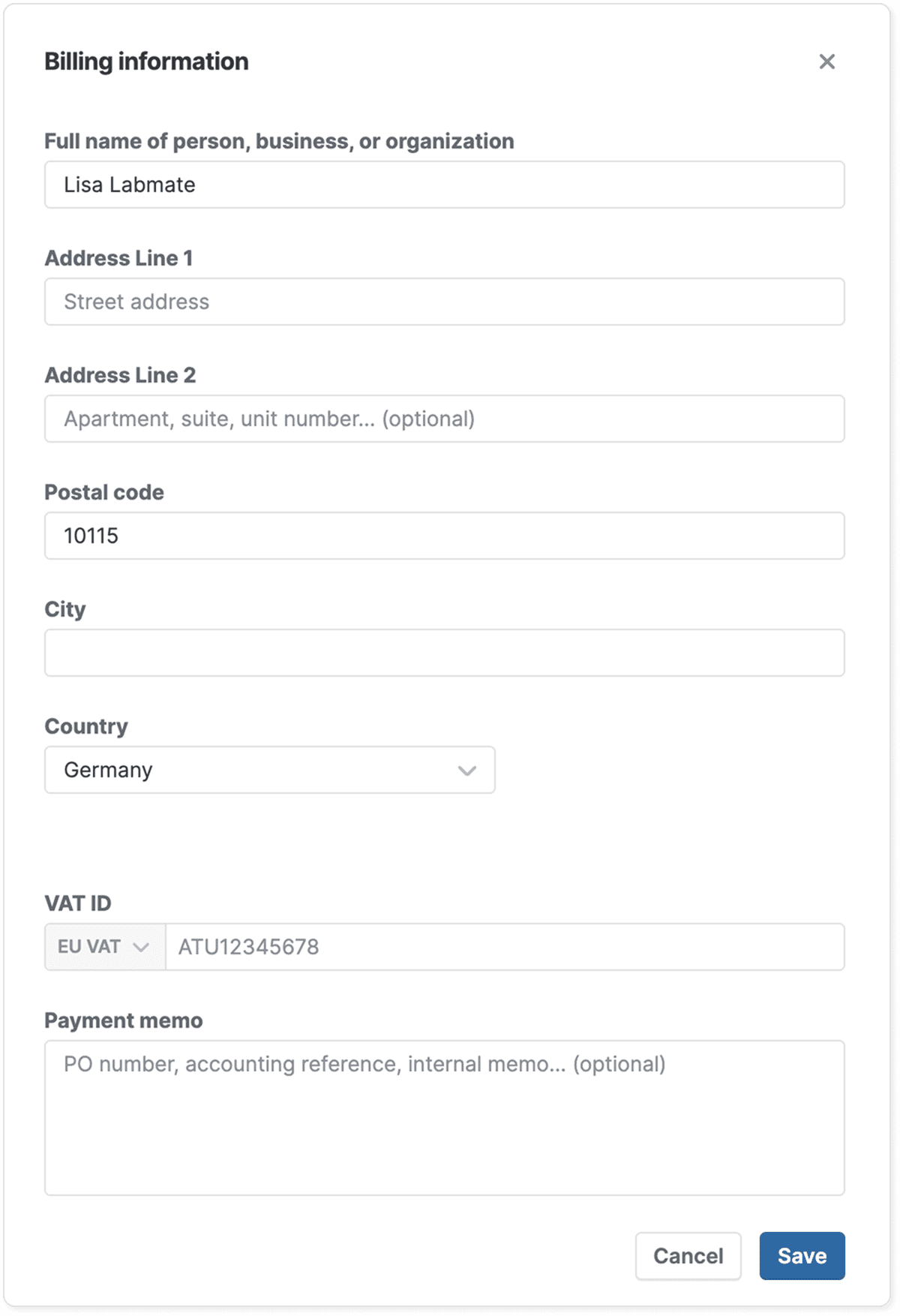 You cannot change the billing information after an invoice is paid. However, it’s possible to add some additional information for administrative purposes to a receipt as a “Payment memo”.