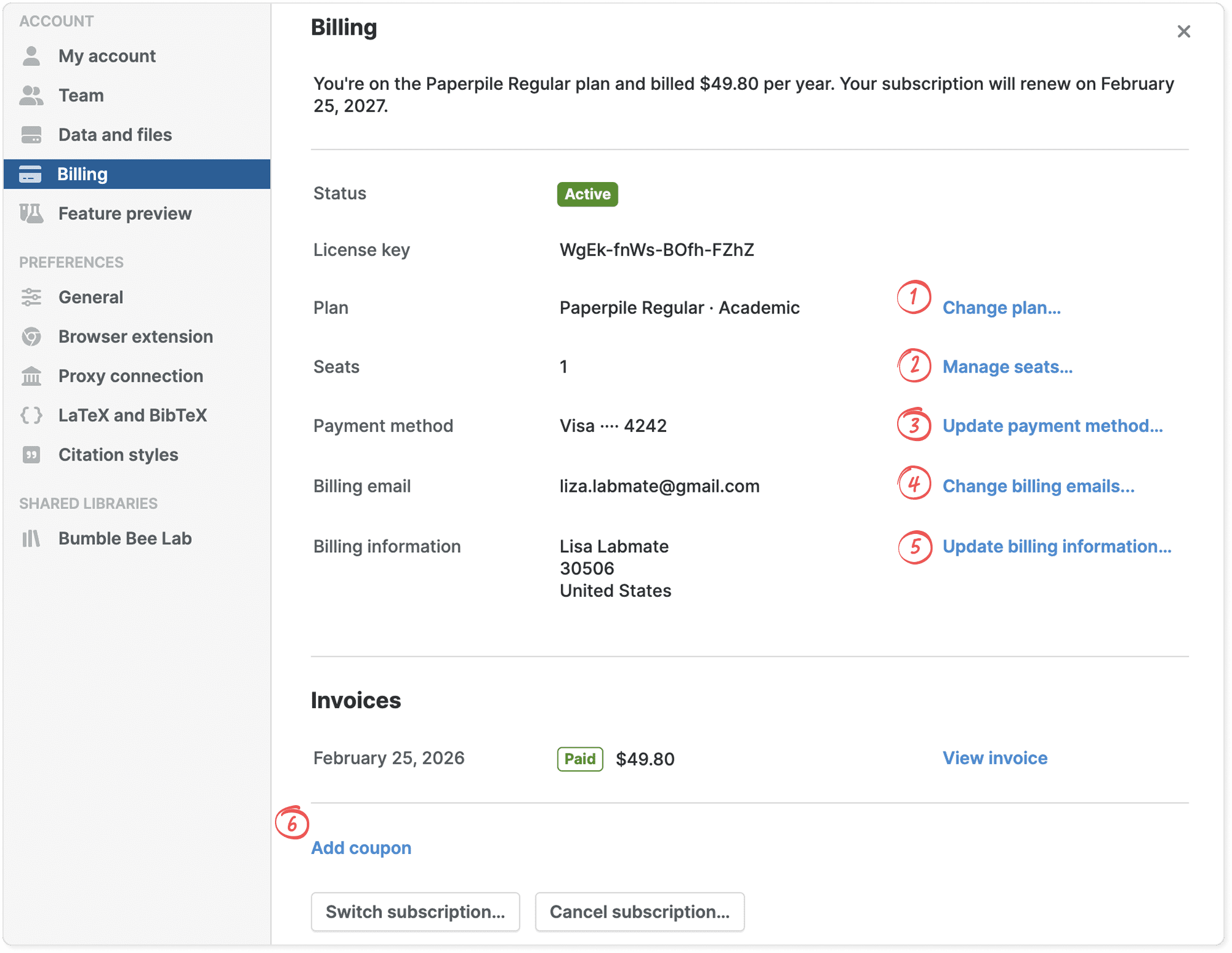 In Settings > Billing you see a summary of your current subscription. It also allows you to make changes to your subscription.