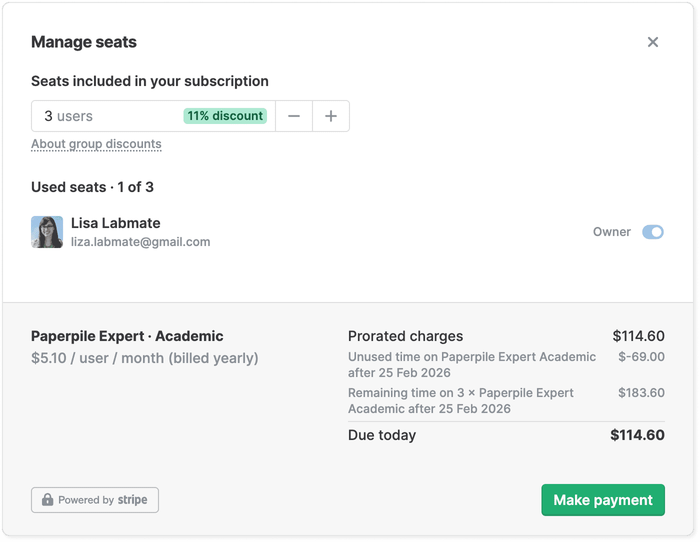 If you have chosen a more expensive plan, finish the payment by clicking Make payment. Your credit card will be charged or if you are paying by invoice, a new invoice will be sent to you and your billing contacts.