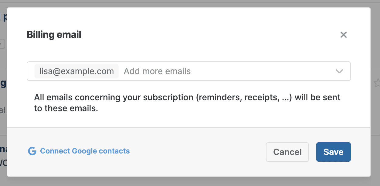 In Settings > Billing, click Change billing emails to add or remove billing contacts. Any email address included here will receive all emails related to this subscription. Note: The owner of the subscription always will be included.