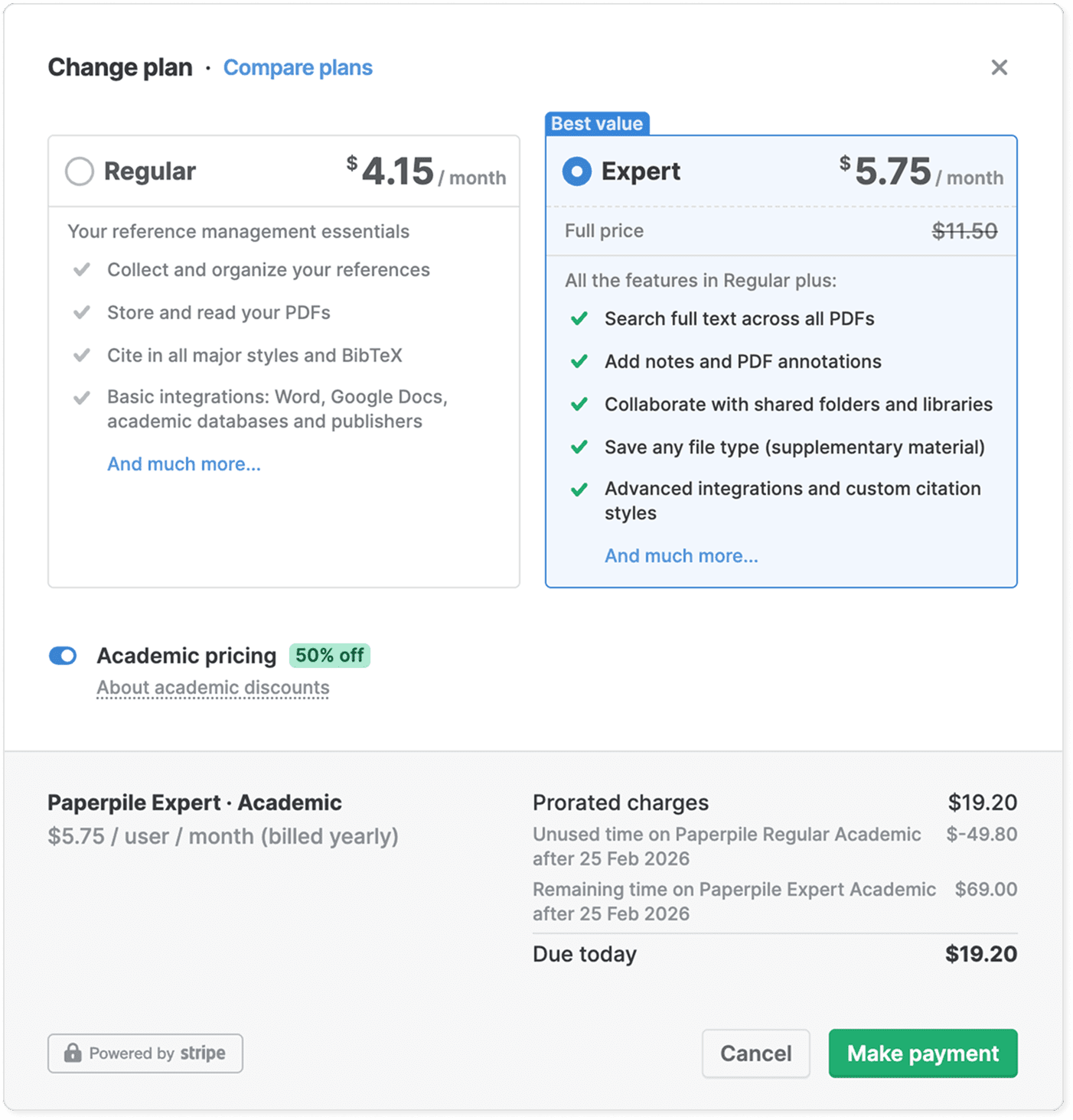 If you have chosen a more expensive plan, finish the payment by clicking Make payment. Your credit card will be charged or if you are paying by invoice, a new invoice will be sent to you and your billing contacts.