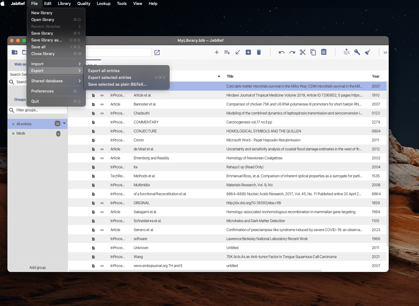 - Export your JabRef library as BibTeX, which is the default format of your library. Or, alternatively, you can select individual entries to export JabRef. Go to File > Export > Export selected entries and choose BibTeX or RIS format.