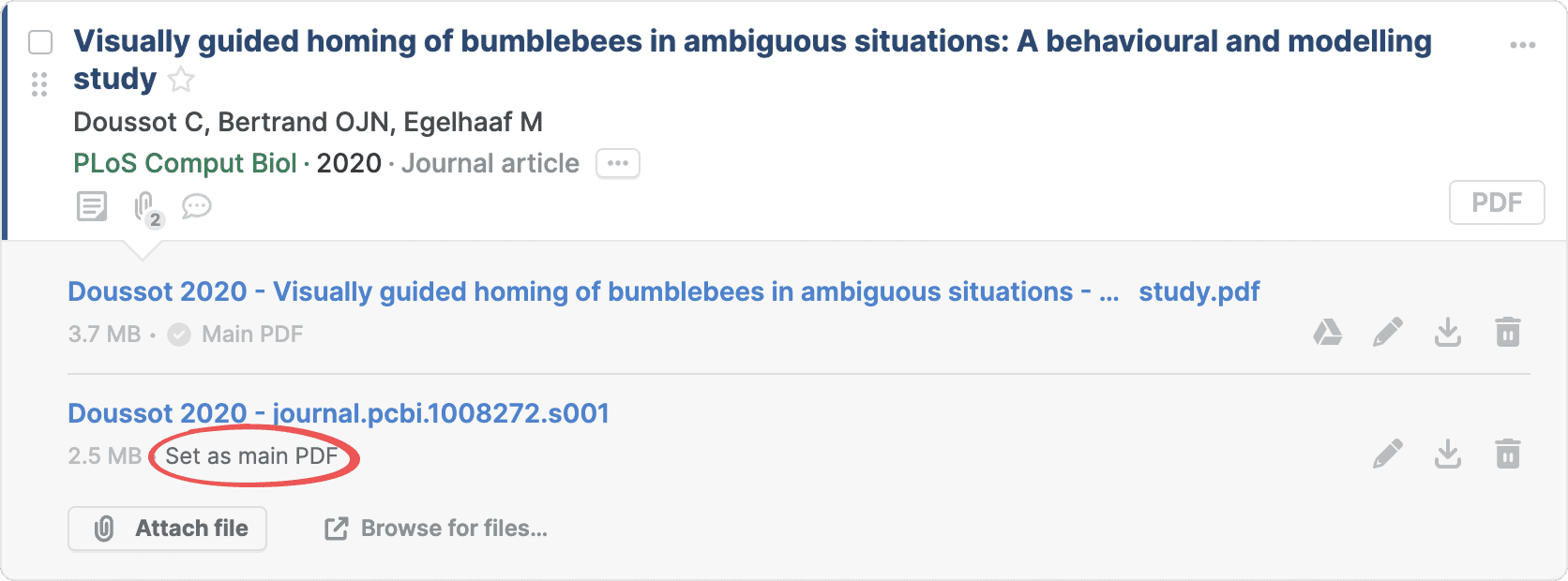 Click the paperclip to open the files panel, find the PDF you want to set as the main PDF, and click Set as main PDF. The main PDF appears at the top of the file list.