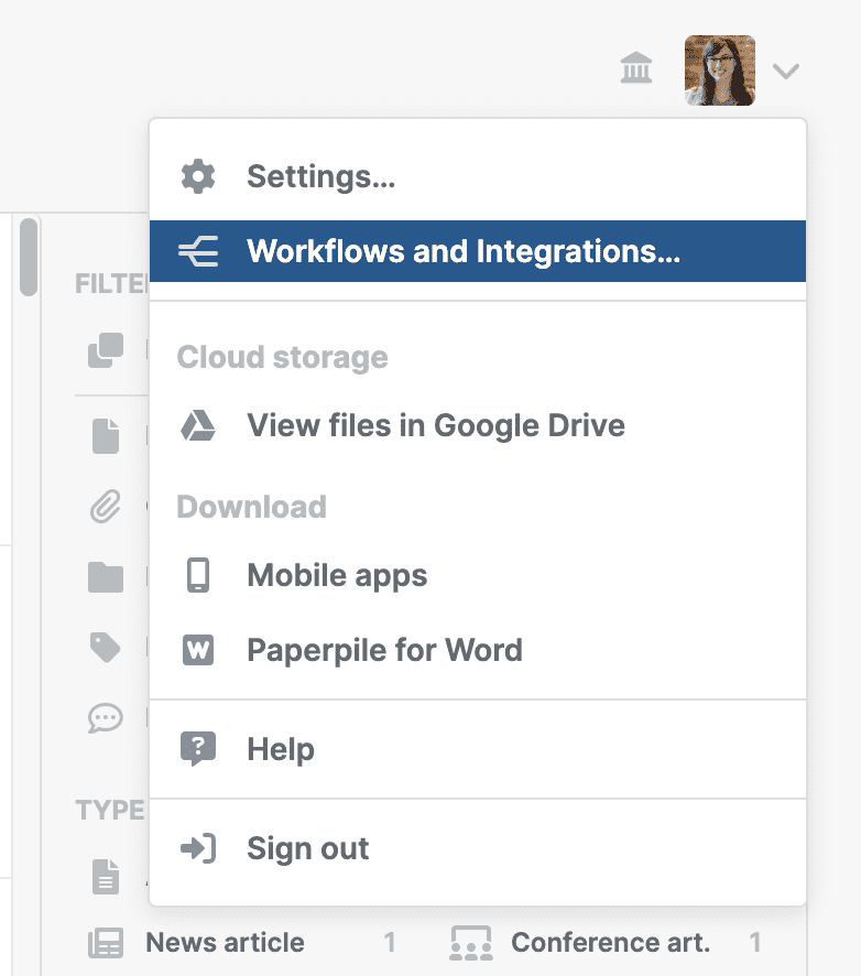 - Choose Workflows and Integrations from the profile menu on the top right