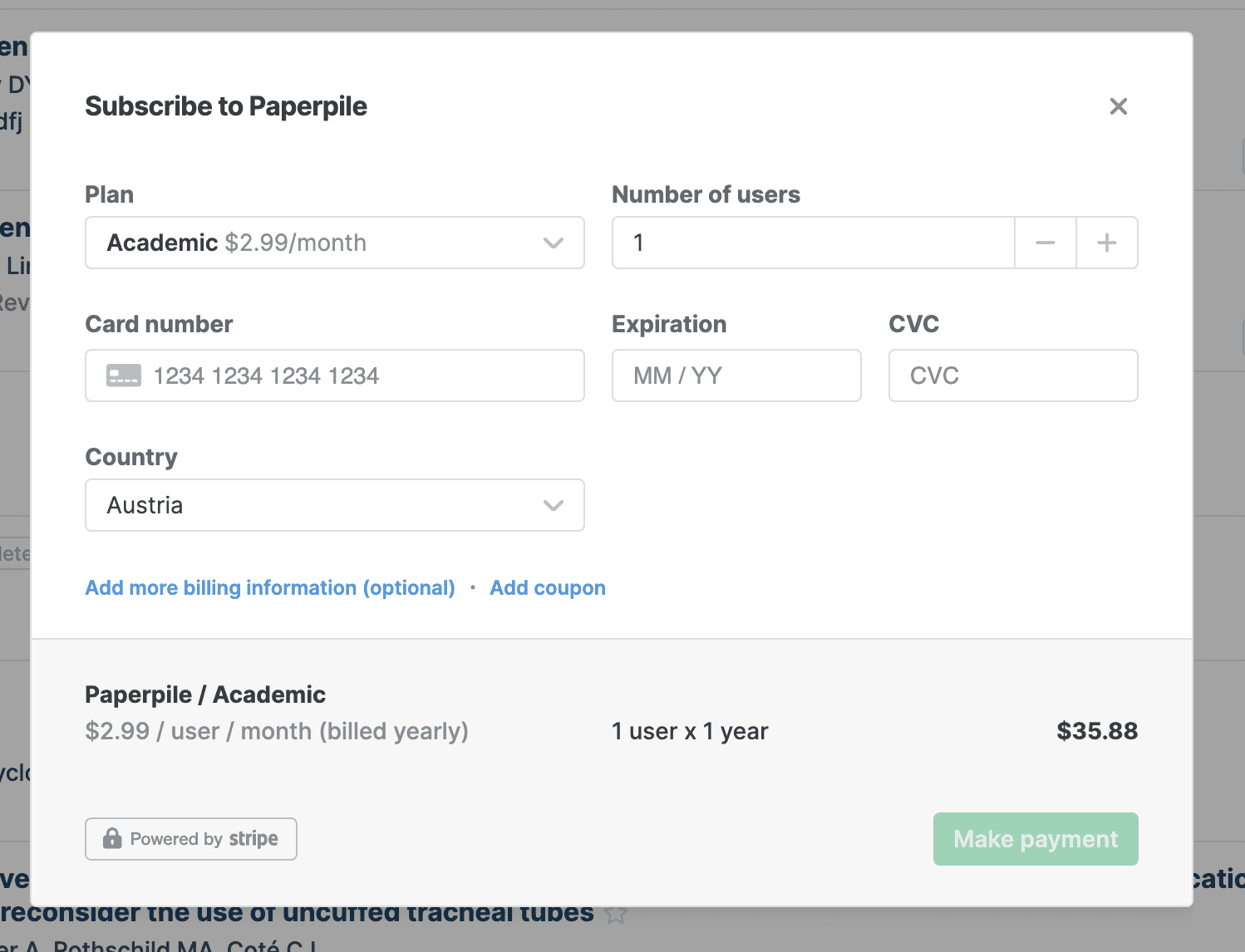 If you do not have a credit card we offer alternative payment options including PayPal and some other country specific options. These will be added as options later this year. For the time-being send us a note at support@paperpile.com and we’ll send you instructions.