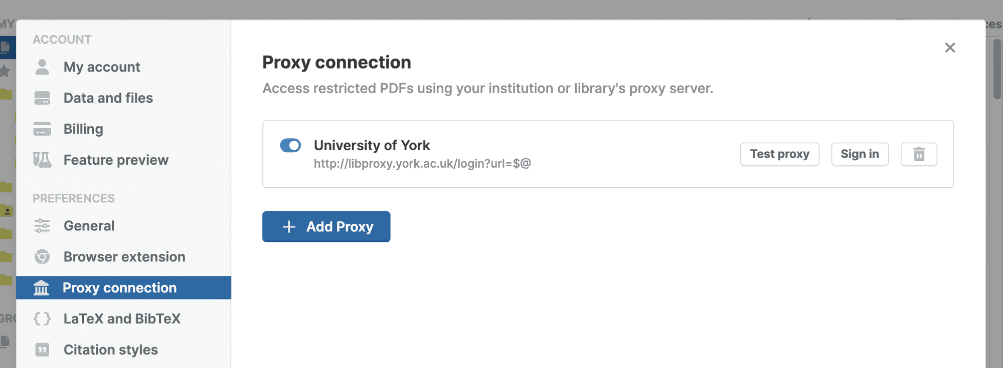 If Paperpile can't access a PDF, it will retry downloading it through your proxy connection. You can configure multiple connections and activate and de-activate connections right from the main screen using the proxy connection menu on the top right: