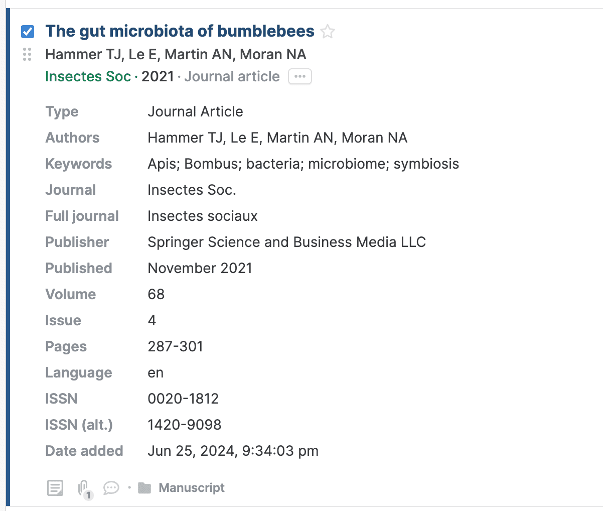 Each reference has metadata fields with all the information required to correctly cite and find them, such as Title, Authors, Journal, Date published, and more.
