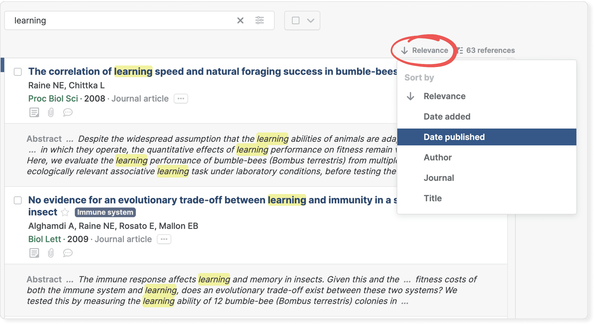 By default, search results are sorted by relevance. Matches in titles, journals, and other key metadata appear higher in results than matches found in abstracts, notes, or PDF full text.