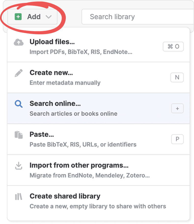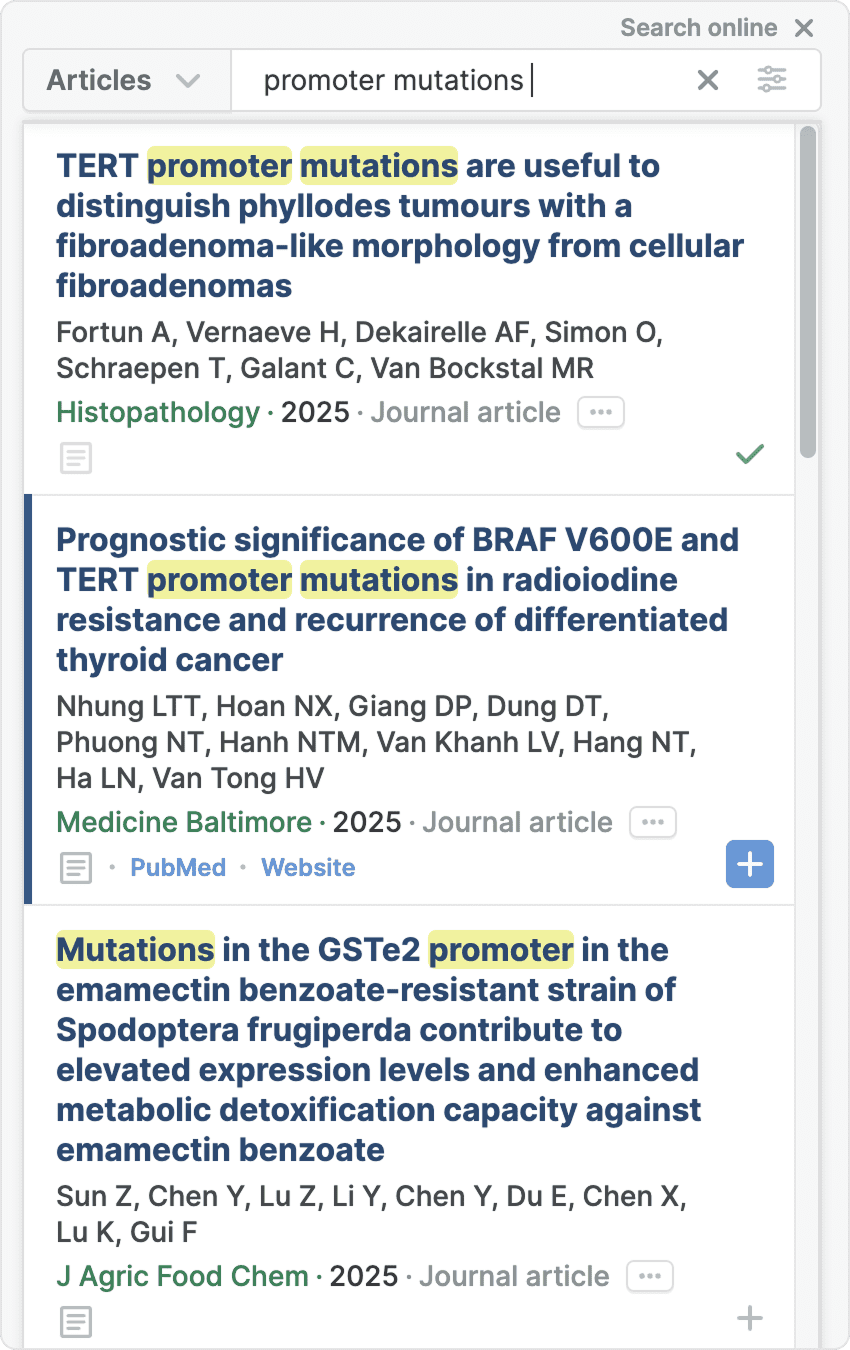 Paperpile's built-in online search allows you to find new references without leaving your library. You can search for articles, books, and preprints and add them directly to your collection.