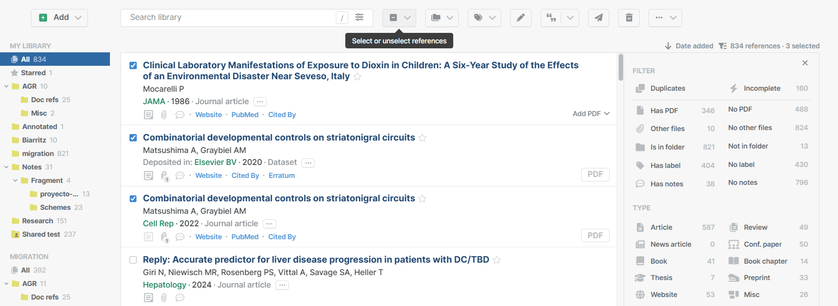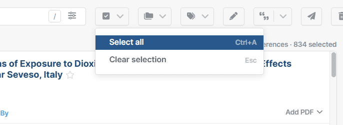 You can select one or more references in the reference list to perform different actions. Selected references show a blue checkbox on the left and a toolbar appears at the top. The number of selected references appears on the top right of the list.
