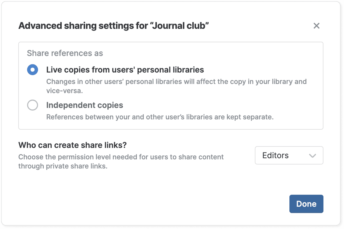 - Share references as: Choose whether references added by other users are live copies from their libraries or independent copies. If you choose “live copies”, any changes other users make in their library will also affect the references in your library. If you choose “independent copies”, the copy in the shared folder is not affected by changes in the original copy from the user's personal library.