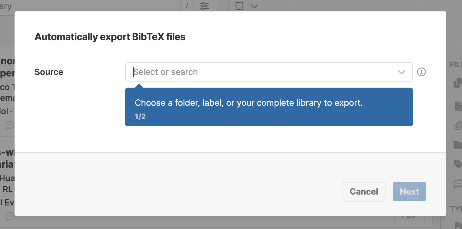 Select which references you want to sync to the BibTeX file. You can choose specific folders, labels, or your whole library.