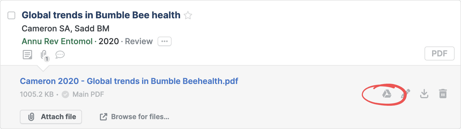 - To check if a file is synced, open the file panel by clicking the paperclip symbol of the reference in the main list. The drive icon indicates the sync status of a file: