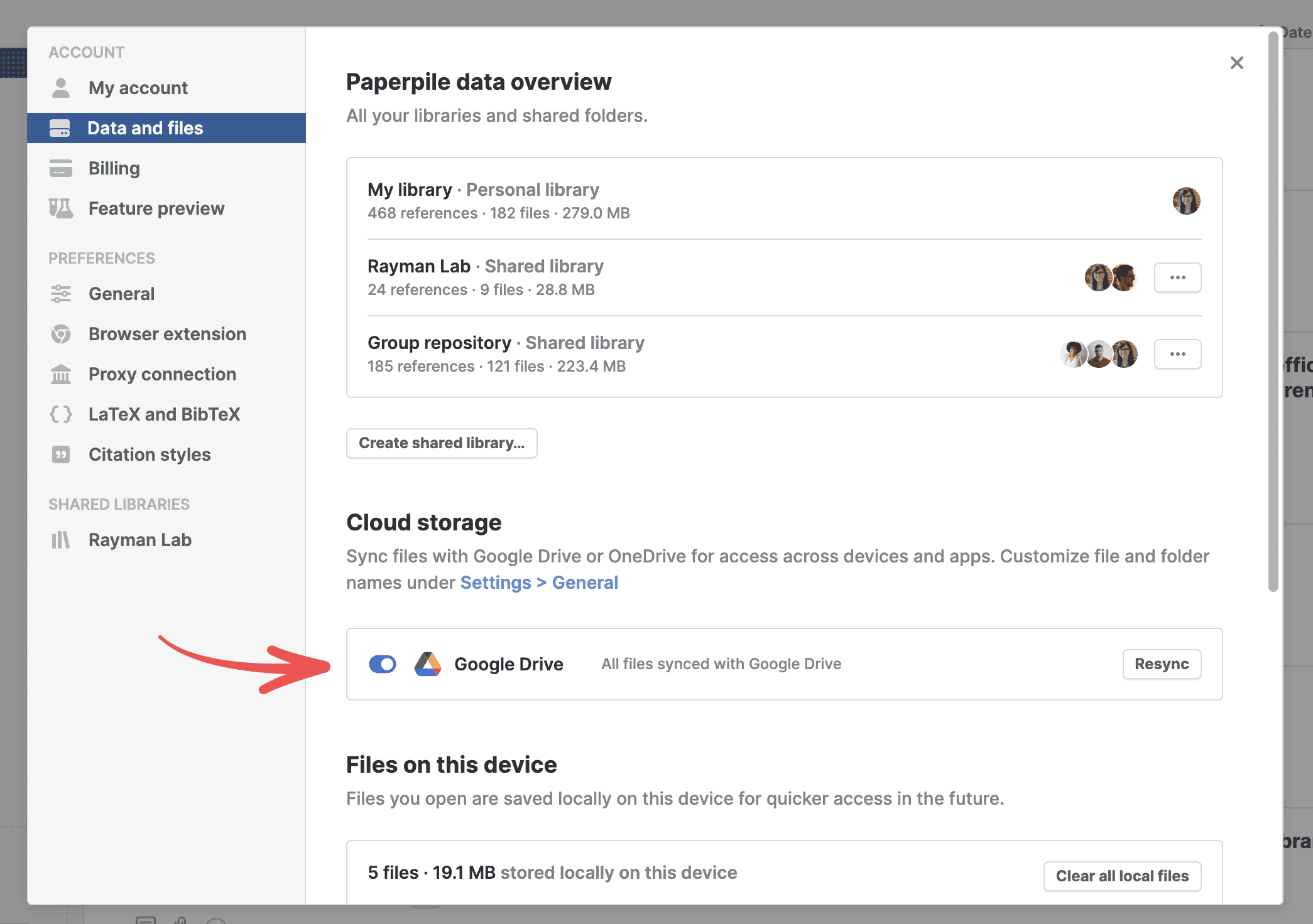 - The drive icon says "Sync has been disabled because of errors": If there are problems syncing your files (e.g. Google's server is temporarily overloaded), Paperpile will automatically try again, and no action is required. However, if a problem persists and several sync attempts fail, syncing will be disabled. Wait some time, then go to Settings > Data and files > Cloud Storage and click Resync.