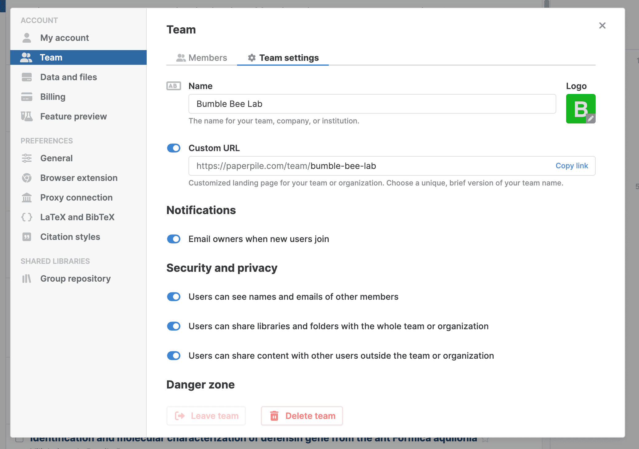 - Logo. The logo identifies your team or organization in various places in Paperpile, for example when sharing a library with your team. You can upload files in most common image formats. We recommend a minimum size of 200x200px.