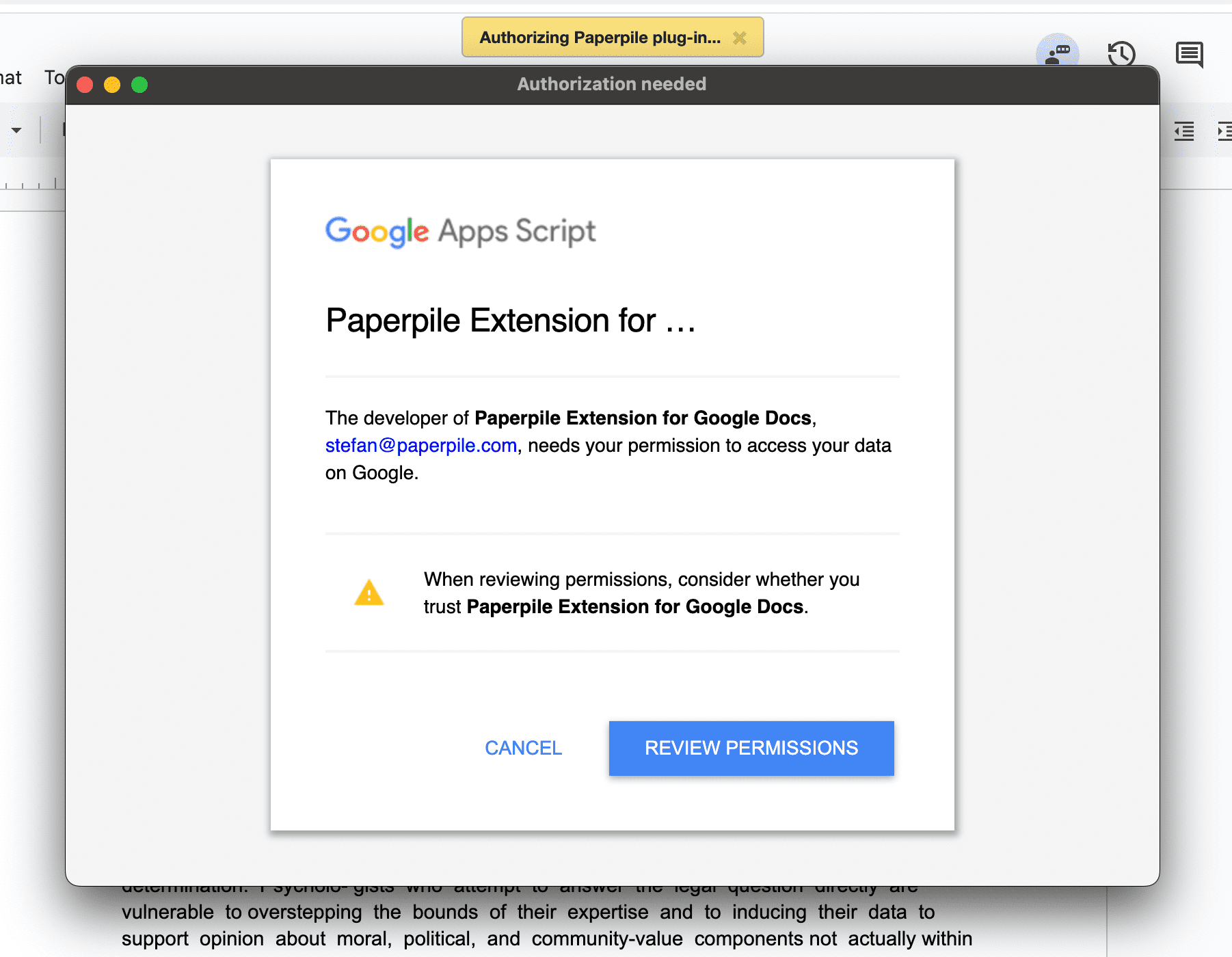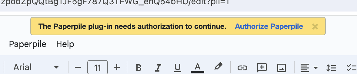 The first time you format a Google Docs document, the Paperpile plugin will require authorization. This allows the Paperpile plugin to scan and modify your document with the same permissions as you do. Note that Paperpile will only process your document when explicitly triggered to do so.