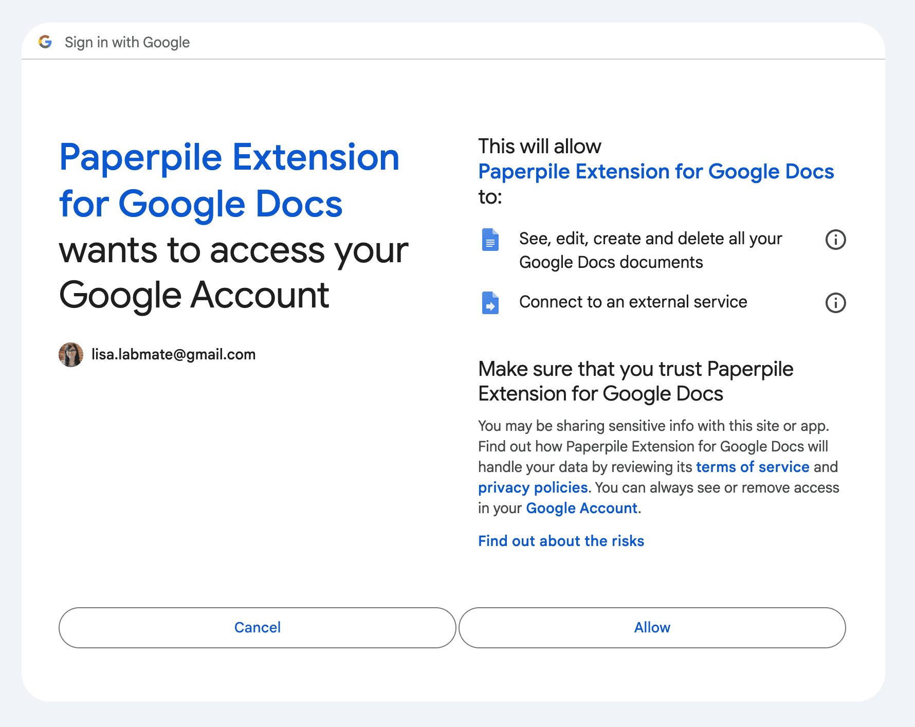 Click Review Permissions and a second window will appear, listing the permissions to be granted to the Paperpile plugin. You can read more details about the Google account permissions we require on this dedicated page.