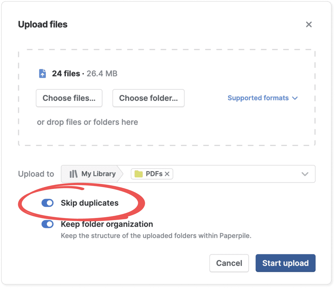 If you try to import a file with a file type not supported by Paperpile, it will not be included in the upload. A pop-up notification appears whenever an unsupported file type is encountered (click Supported file types in the pop-up notification to show the supported types).